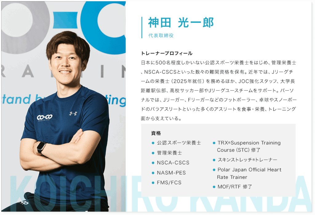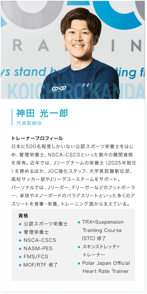 日本に500名程度しかいない公認スポーツ栄養士をはじめ、管理栄養士、NSCA-CSCSといった数々の難関資格を保有。近年は高校サッカー部やJリーグユースチームをサポート。