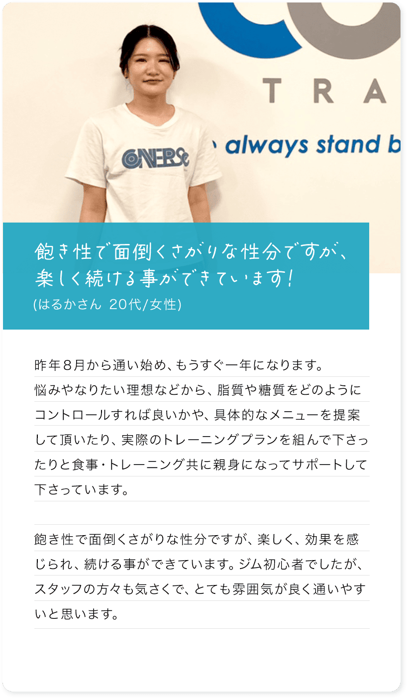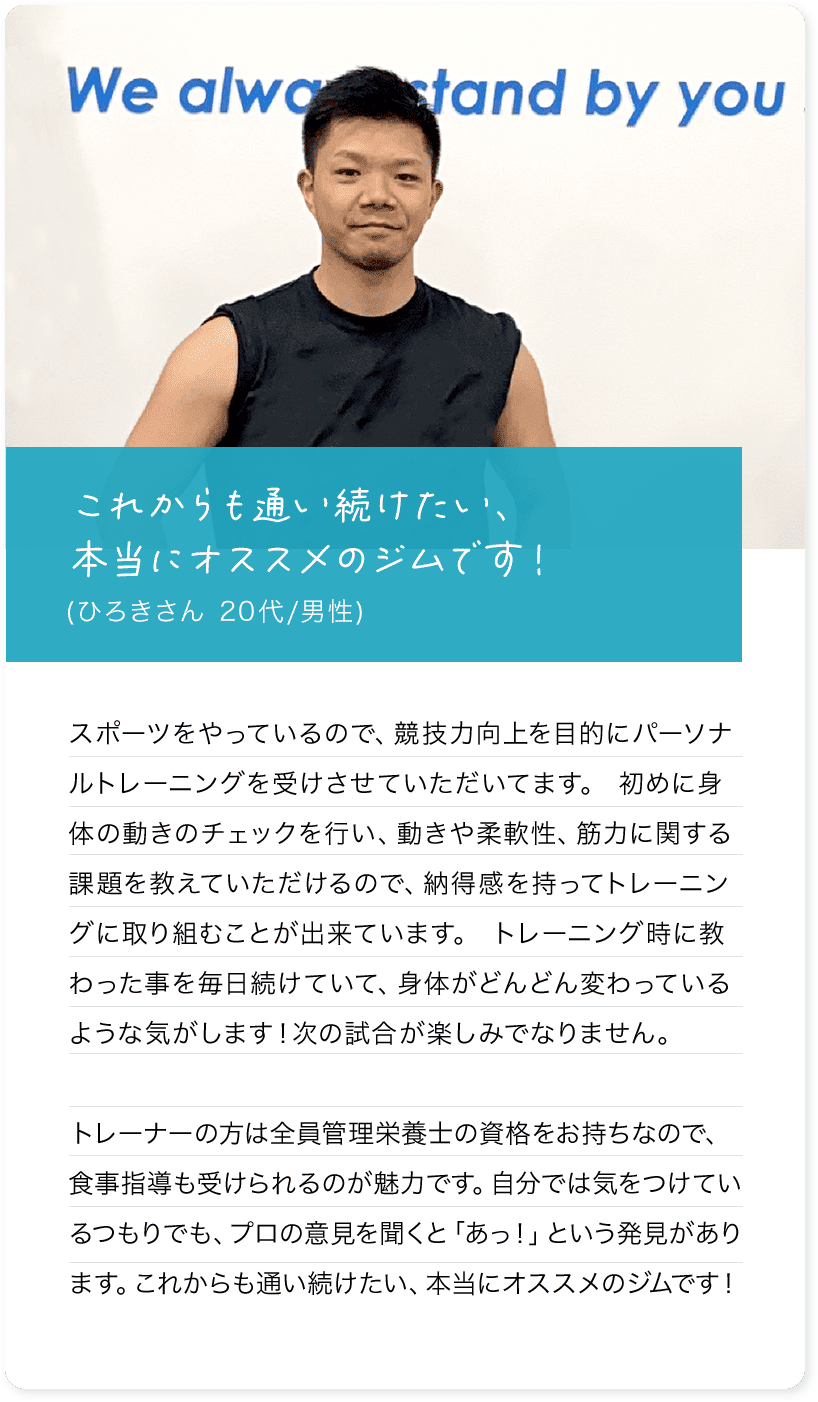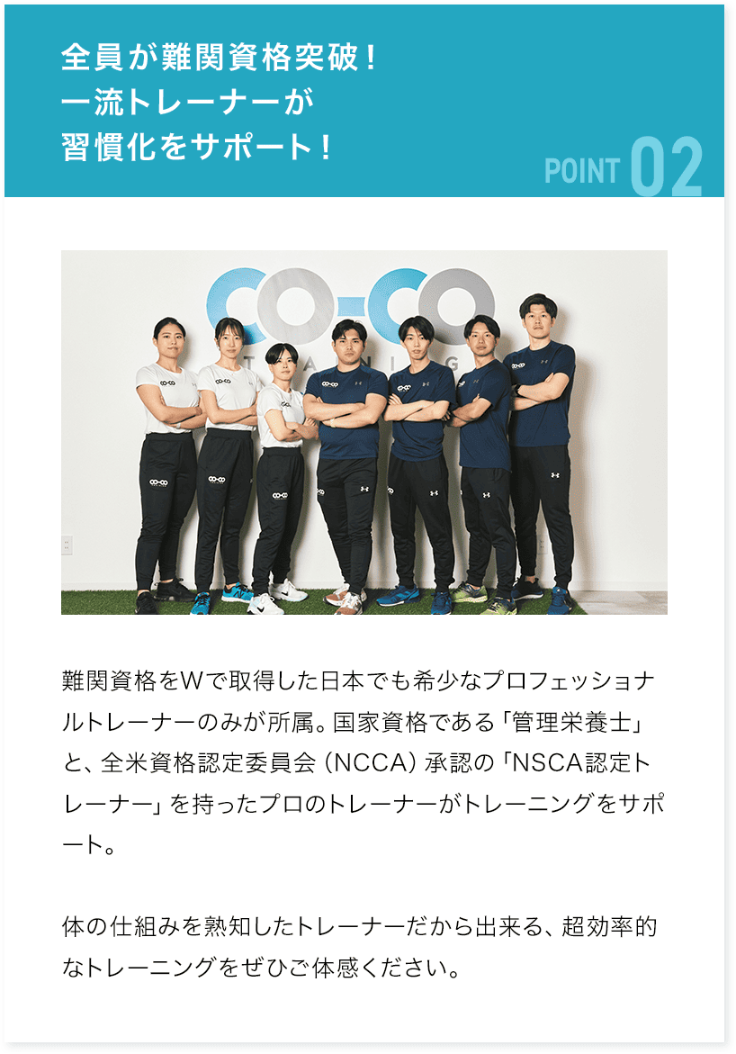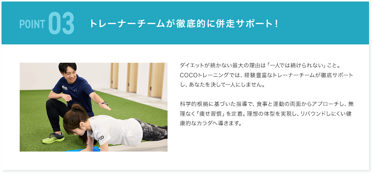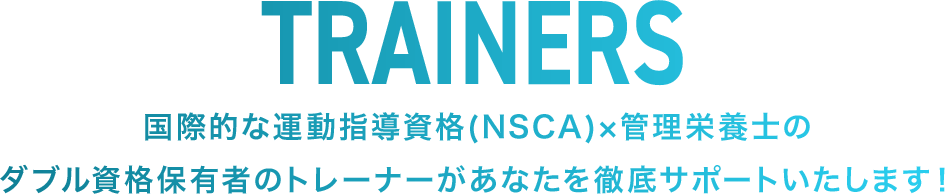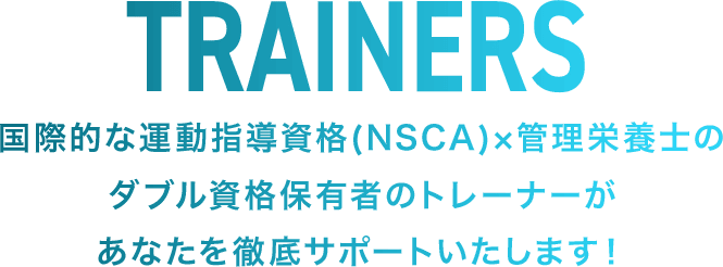 国家資格である「管理栄養士」と、全米資格認定委員会(NCCA)承認の「NSCA認定トレーナー」を持ったプロのトレーナーがトレーニングを併走サポート。