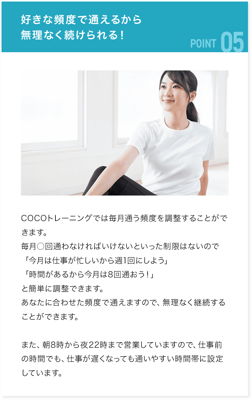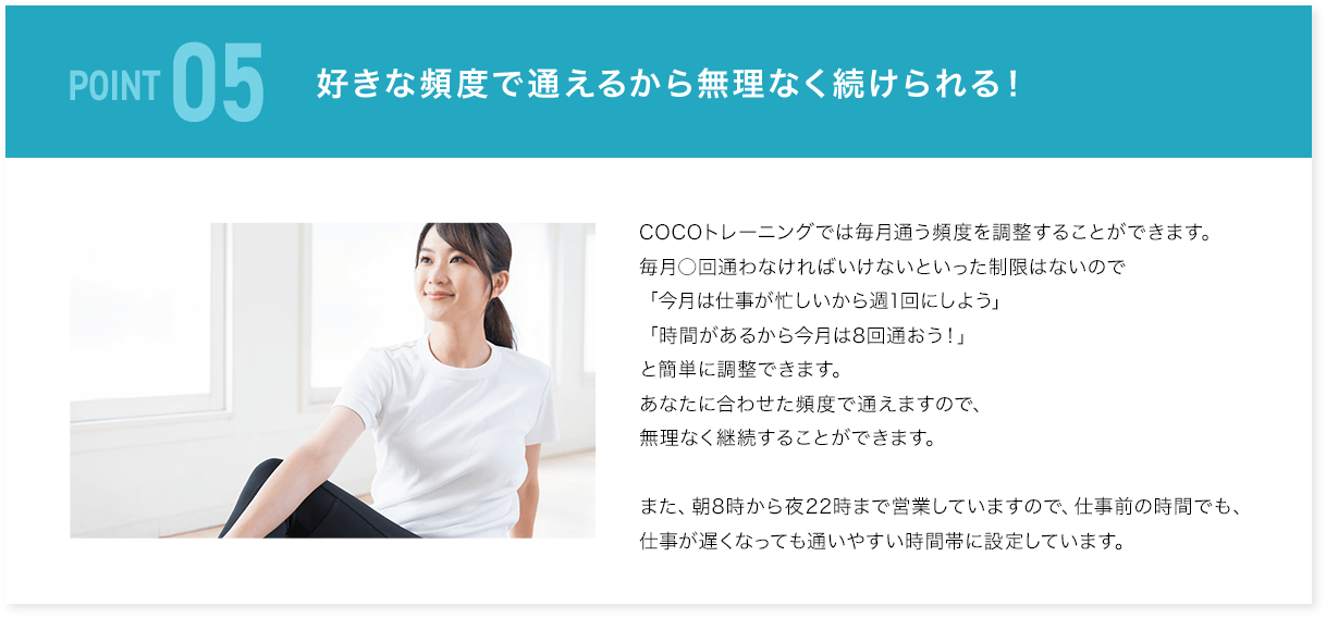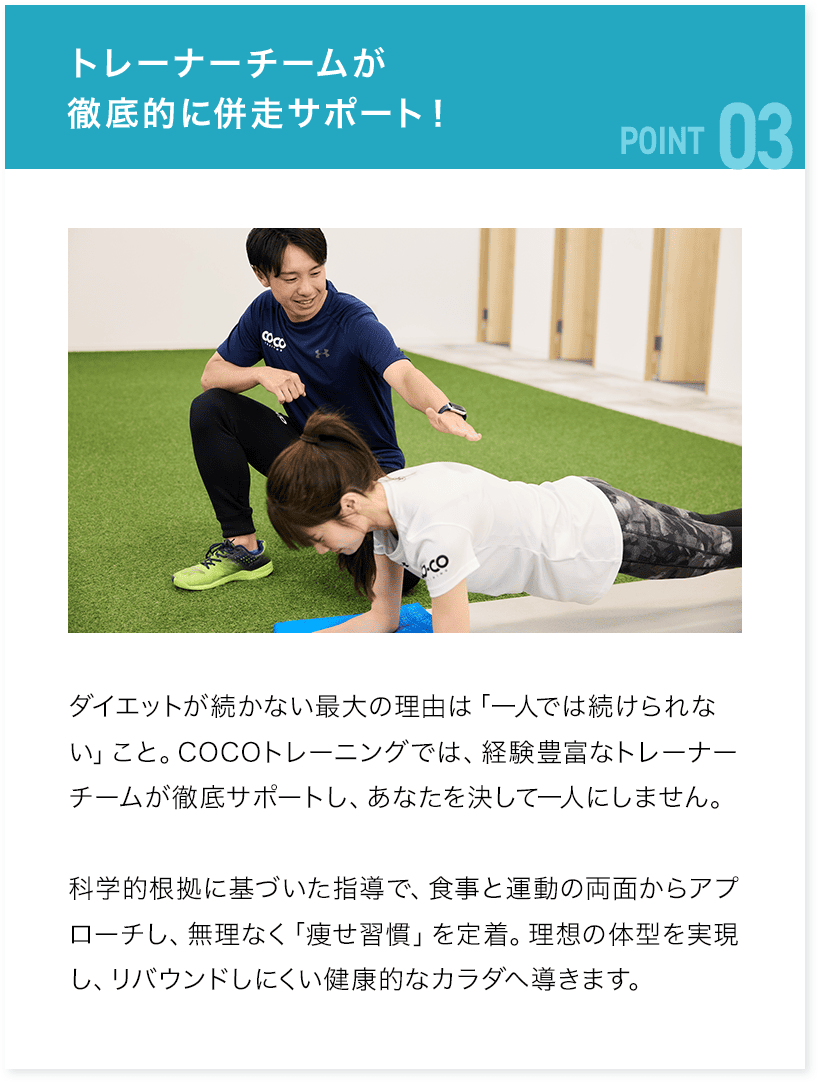 日常に取り入れて、食事も運動も健康的に一生続けられる「痩せ習慣」を身につけることでリバウンドしにくい身体へと作り変えていきます。