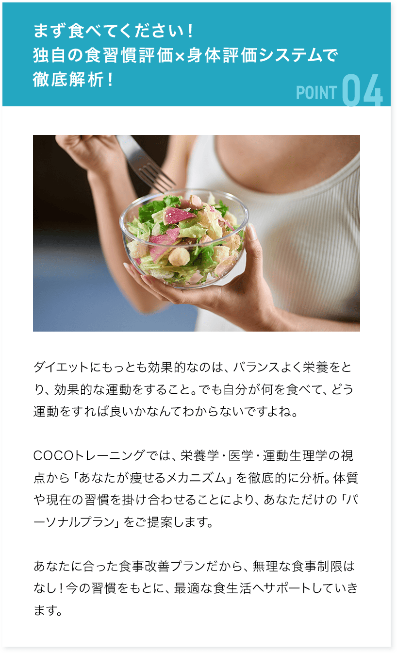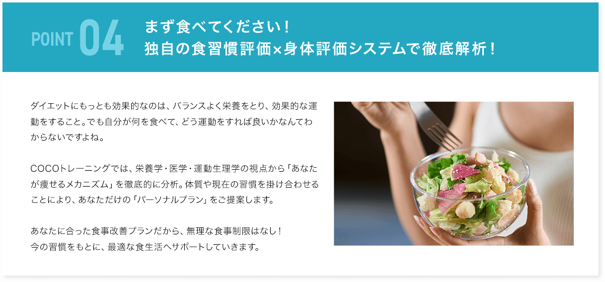 COCOトレーニングでは、栄養学・医学・運動生理学の視点から「あなたが痩せるメカニズム」を徹底的に分析。