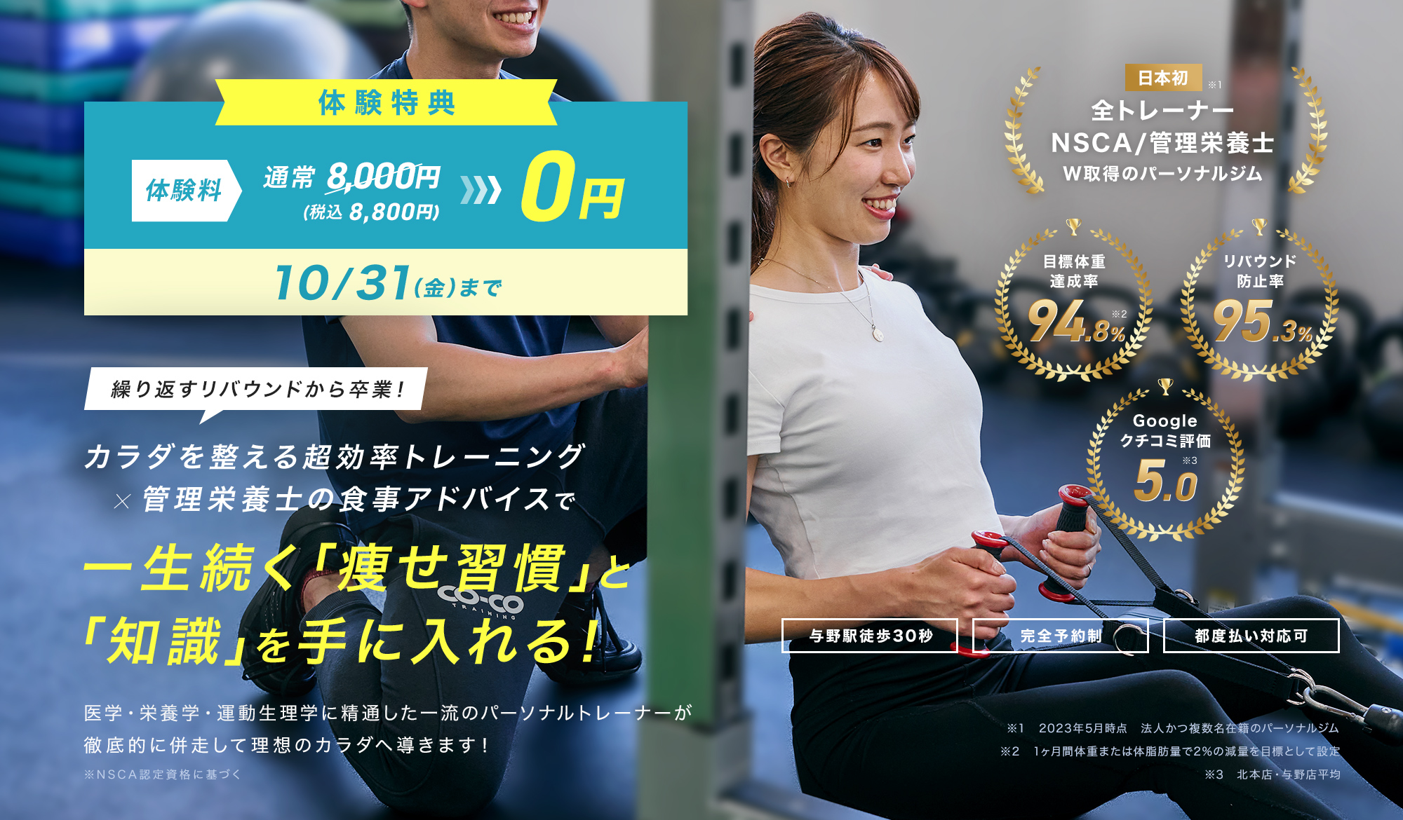 スポーツをやっているので、競技力向上を目的にパーソナルトレーニングを受けさせていただいてます。 初めに身体の動きのチェックを行い、動きや柔軟性、筋力に関する課題を教えていただけるので、納得感を持ってトレーニングに取り組むことが出来ています。 まだ通い始めたばかりですが、COCOでのトレーニングや、トレーニング時に教わった事を毎日続けていて、身体がどんどん変わっているような気がします!次の試合が楽しみでなりません。 店内はとても綺麗で、開放感があります。スタッフの皆さまも丁寧に接して下さいますので、トレーニングに行くのが楽しみになっています。 トレーナーの方は全員管理栄養士の資格をお持ちなので、食事指導も受けられるのが魅力です。自分では気をつけているつもりでも、プロの意見を聞くと「あっ!」という発見があります。 これからも通い続けたい、本当にオススメのジムです!