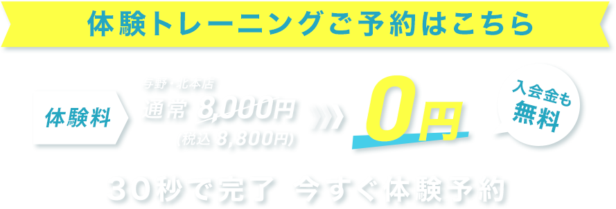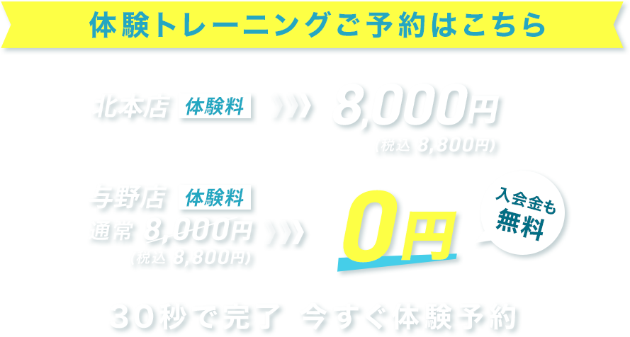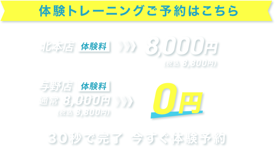 123456789101112月12345678910111213141516171819202122232425262728293031日8:00〜9:00〜10:00〜11:00〜12:00〜13:00〜14:00〜15:00〜16:00〜17:00〜18:00〜(平日のみ)19:00〜(平日のみ)20:00〜(平日のみ) ※体験予約受付はご希望日前日までとなります